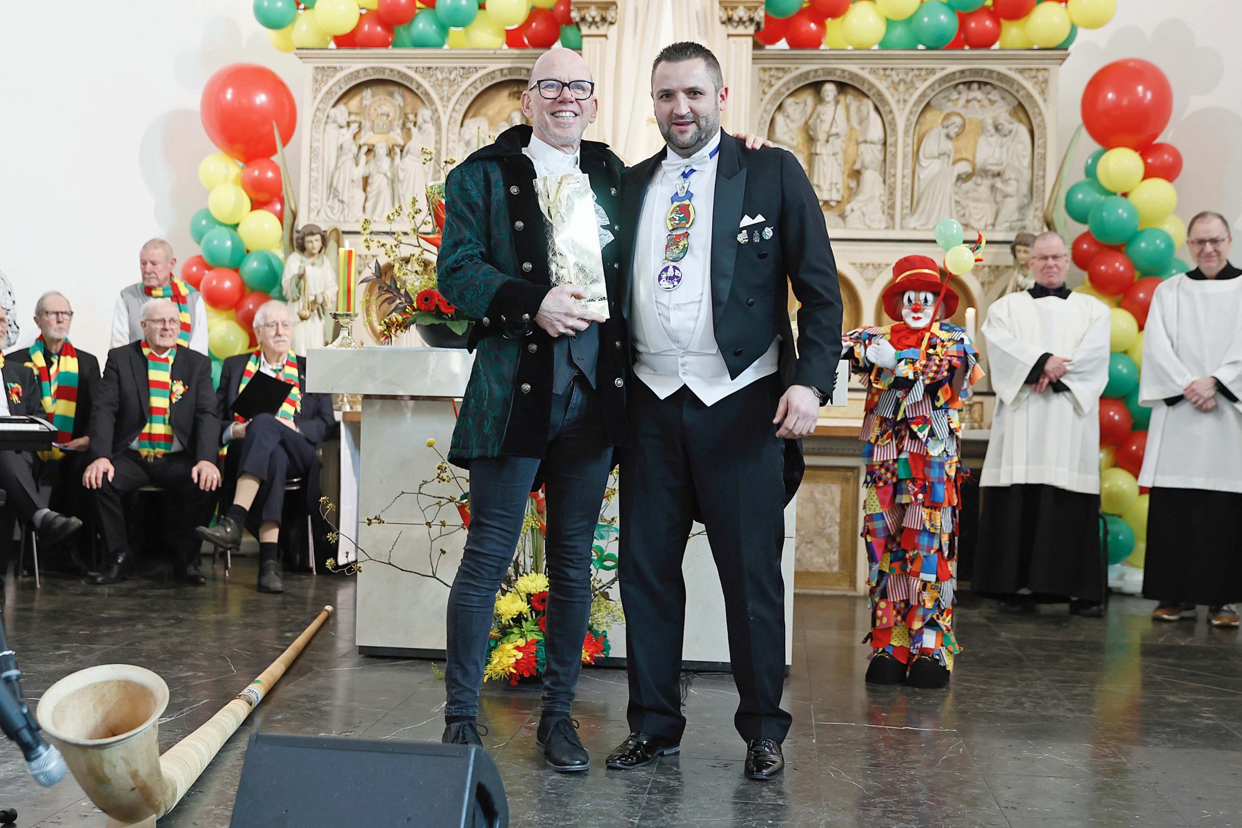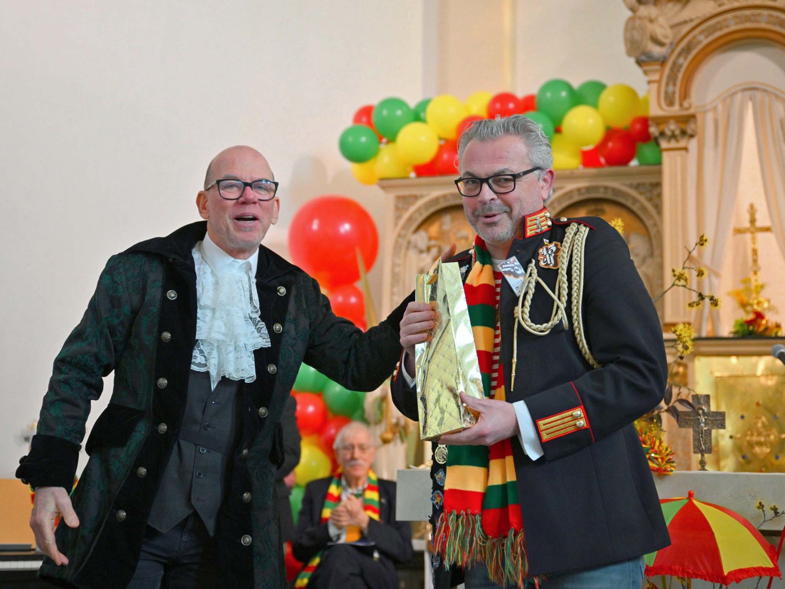 | Klik op de afbeelding om deze te vergroten en blader door het album via cursors > en < . Verrassende Koempelmis op zondag 16 november De Koempelmis voor de verongelukte koempels van de Willem Sophia mijn in Spekholzerheide op zondag 16 november j.l. in de Petrus en Paulus kerk in Schaesberg was om meerdere redenen verrassend. De mis werd voor het eerst vocaal opgeluisterd door gemengd koor Musica Vincit uit Landgraaf o.l.v. Augustine Boshouwers en op orgel begeleid door Pavlina Heckmanns. Met een aantal prachtig uitgevoerde koornummers en op het einde van de mis natuurlijk met het samen met de bezoekers van de mis gezongen ‘Glück auf’. Maar ook met de als extra toegift gezongen koorversie, met solozang van 5 bassen en tenoren, van het nummer ‘D’r Letste Koempel’ van de groep Carboon. De grootste verrassing was echter het geheel onverwachte bezoek van een deel van de cast (figuranten, maar ook hoofdrolspelers) van het theaterspektakel ‘Het Geluk van Limburg’ dat al geruime tijd voor een uitverkochte Rodahal in Kerkrade zorgt. Niet alleen het koor, maar zeker ook de bezoekers uit Kerkrade, waaronder acteurs Huub Stapel en Emil Szarkowicz, kregen een groot applaus van de talrijke en verraste kerkgangers. Het spreekt vanzelf dat met name de oud koempels en zeker initiatiefnemer van de Koempelmis, Wim Schoenmaekers, zeer in hun nopjes waren met dit bijzondere bezoek. Velen van hen gingen in gesprek of op de foto met Stapel en Szarkowicz. Samen met koor en kerkgangers zongen ze vanaf het priesterkoor mee met ‘Glück Auf’. De nazit bij koffie en vlaai werd druk bezocht, omdat de acteurs ook hierbij aanwezig waren en wederom bereid voor een praatje of een foto. |